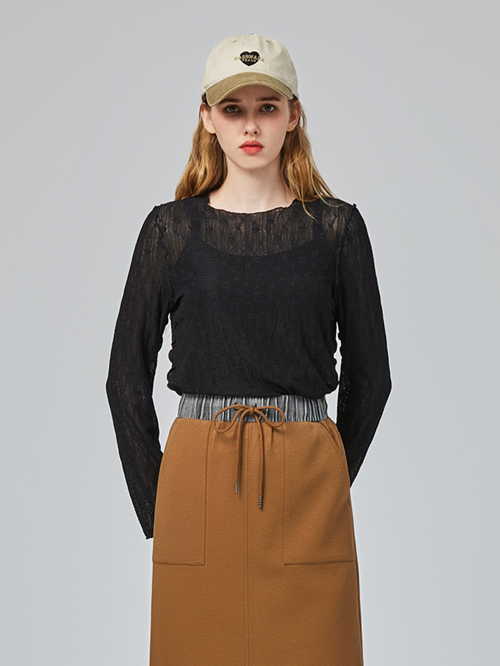 *透膚蕾絲面料 *布料柔軟親膚 *內附肩帶小內搭 *圓領密考呈現波浪造型
