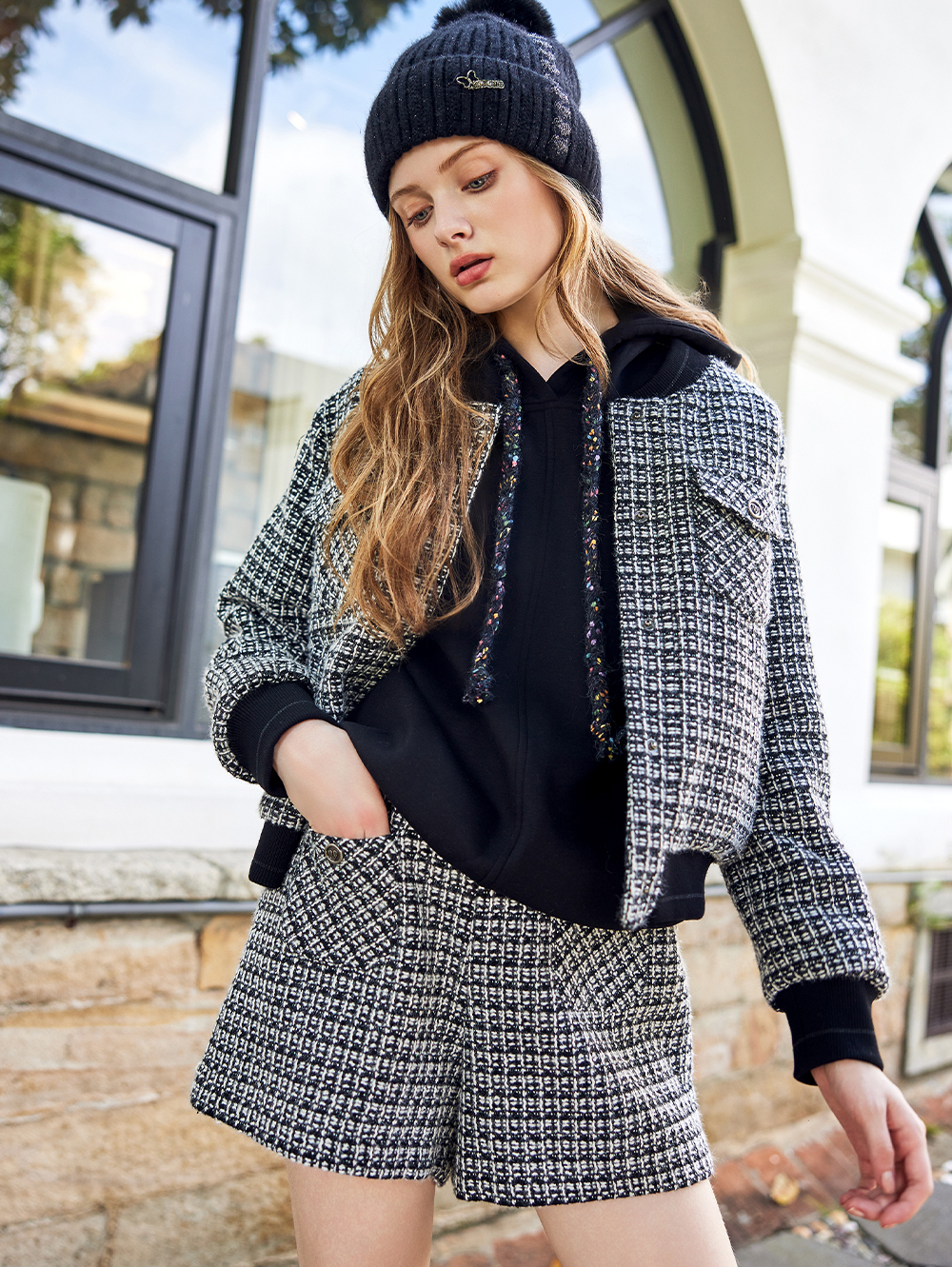 *小香格紋面料 *金屬愛心圓釦 *前貼口袋設計 側邊隱形拉鍊設計