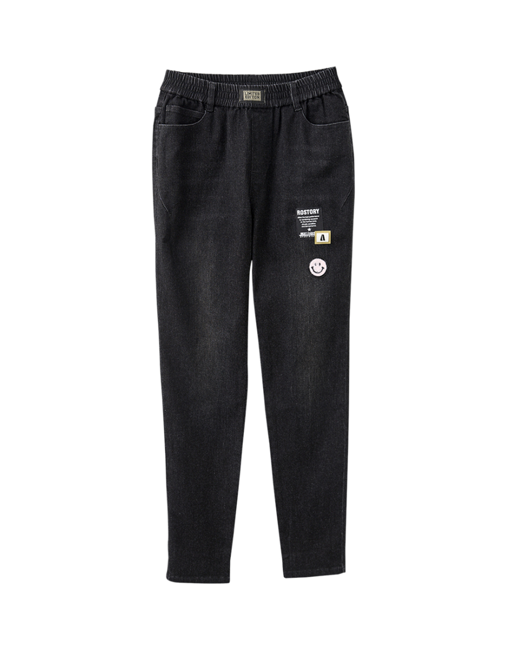 *可愛貼繡造型細節 *窄管直筒版型 *刷色水洗棉質面料 *鬆緊腰頭設計,方便穿脫