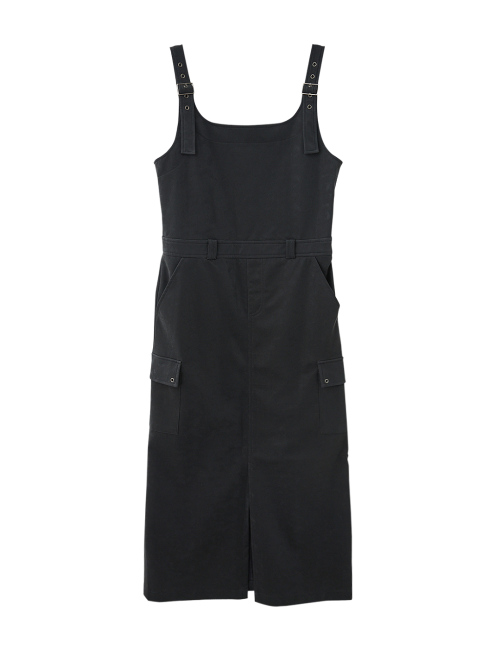 *調節式肩帶,可自由調整長度 *秋季皮革面料 *裙身立體口袋設計 *下擺前開衩,方便活動