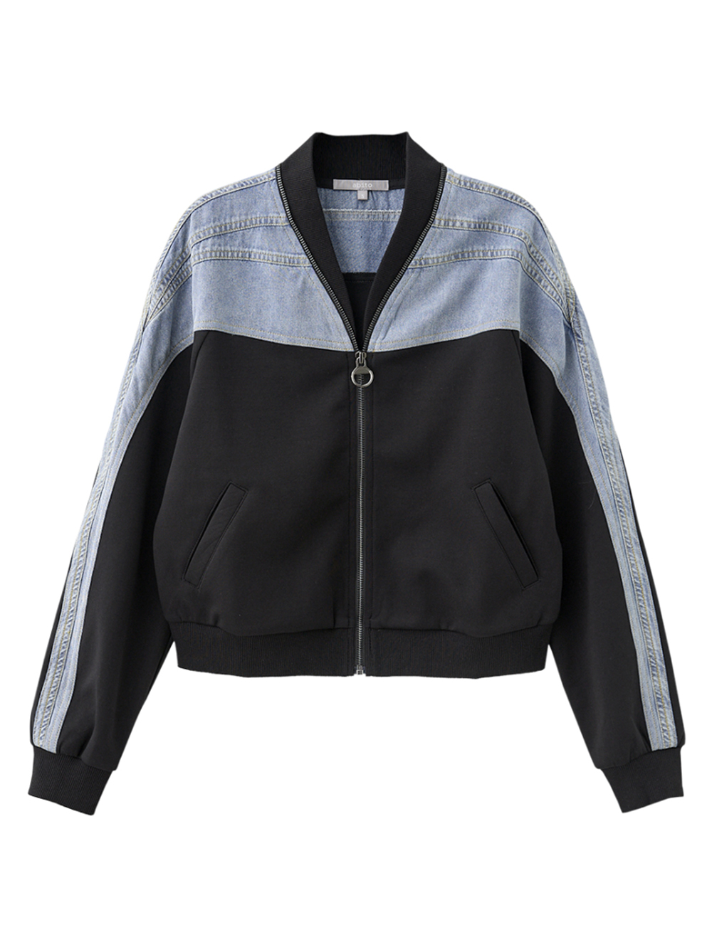 *牛仔布料拼接造型 *拉鍊連接領圍特殊設計 *短版剪裁修身比例 *羅紋立領加強彈性與耐用