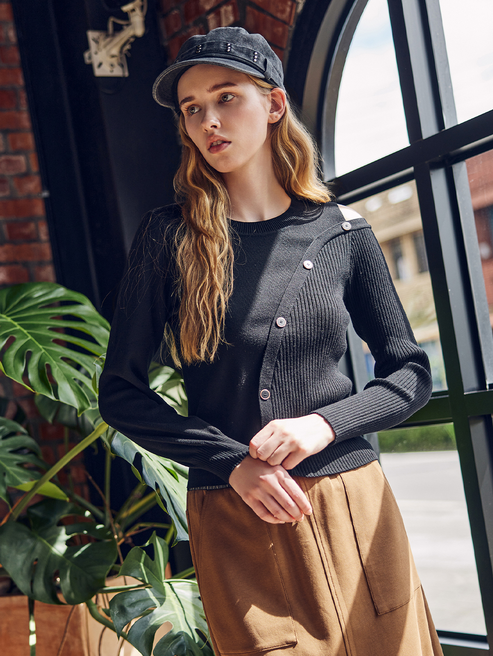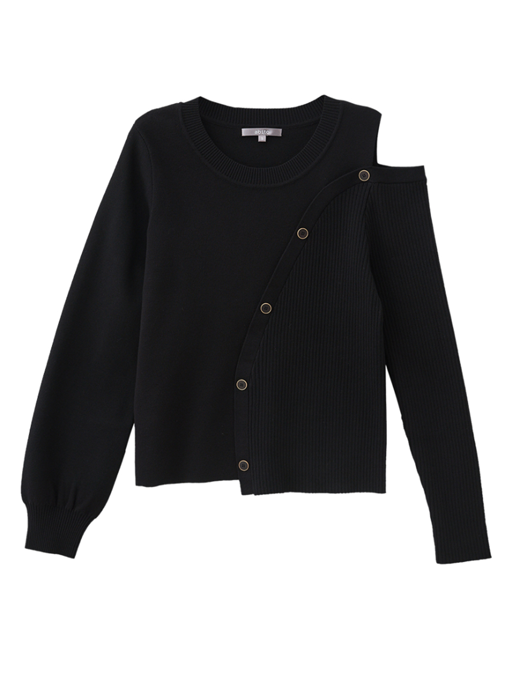*落肩設計修飾手臂線條 *特殊不對稱剪裁裝飾扣 *面料柔軟彈性佳 *收腰版型顯瘦修身
