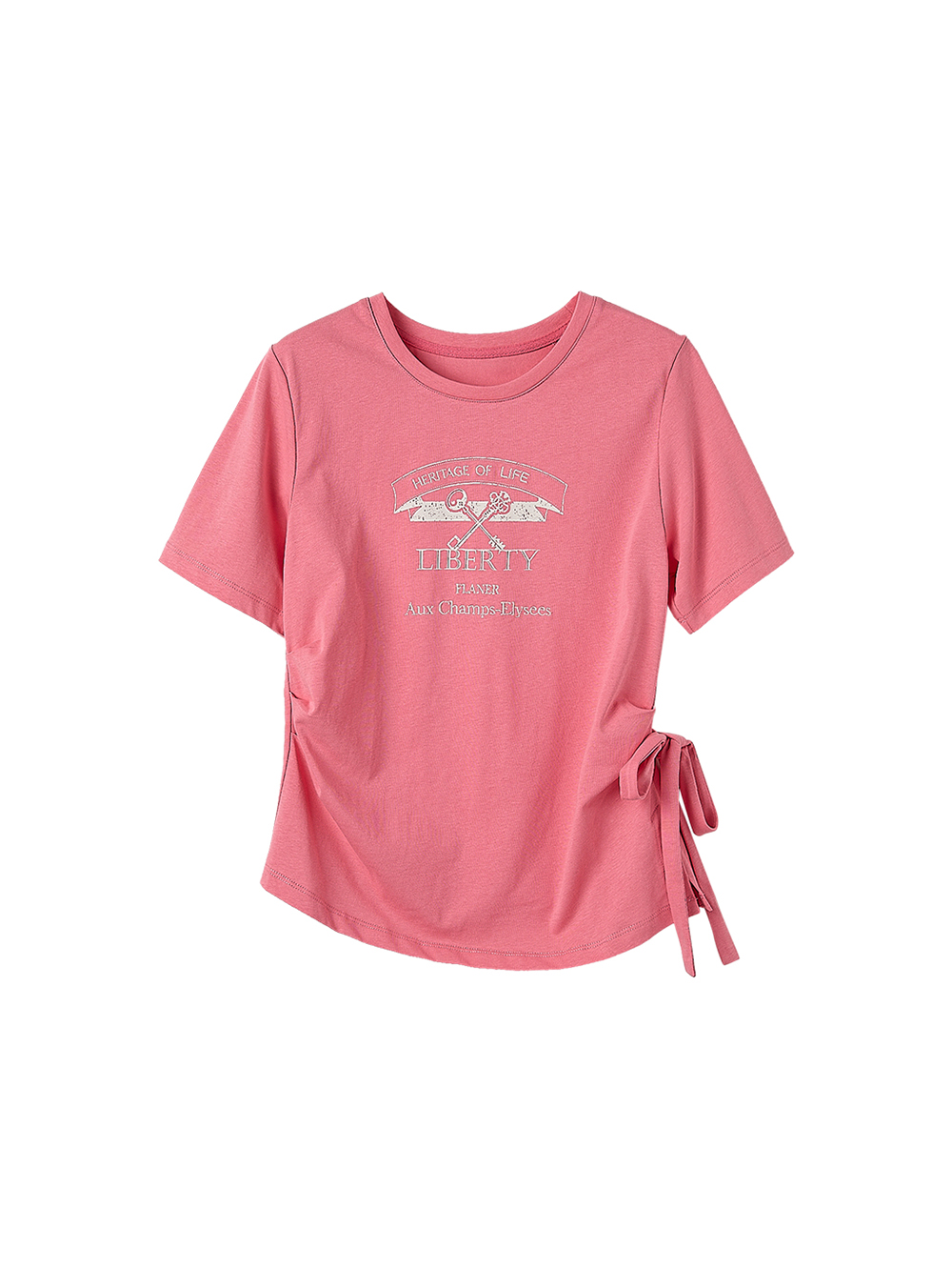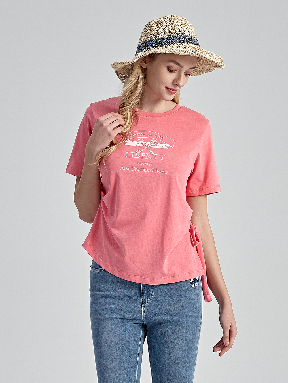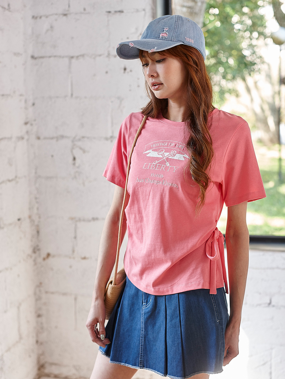 輕鬆版型的T-shirt以印圖及綁帶作點綴,瞬間成為優雅日系穿搭單品,無論搭配裙裝或褲裝都能盡情展現屬於妳的時尚風格。