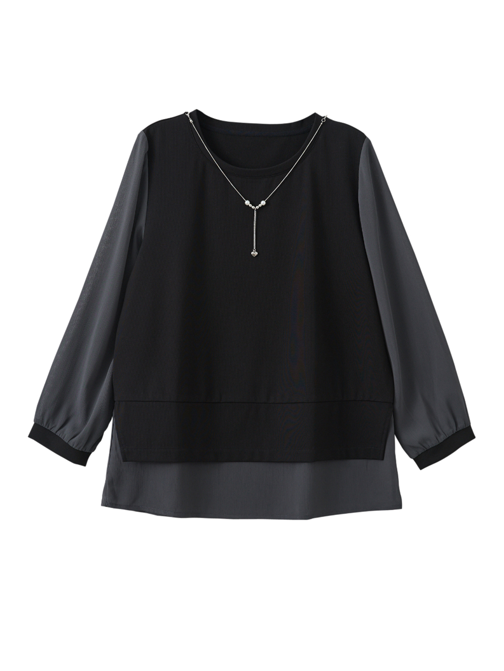 可拆鍊,中長版型彈性衣身與袖口, 雪紡拼接輕盈感提升, 精緻可拆造型項鍊, 可依穿搭自由調整。