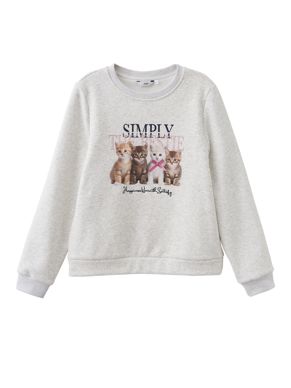 內層加厚刷毛, 觸感柔軟親膚, 穿上立刻升級溫暖度。萌系小貓印花為亮點, 可愛又帶點文青感。