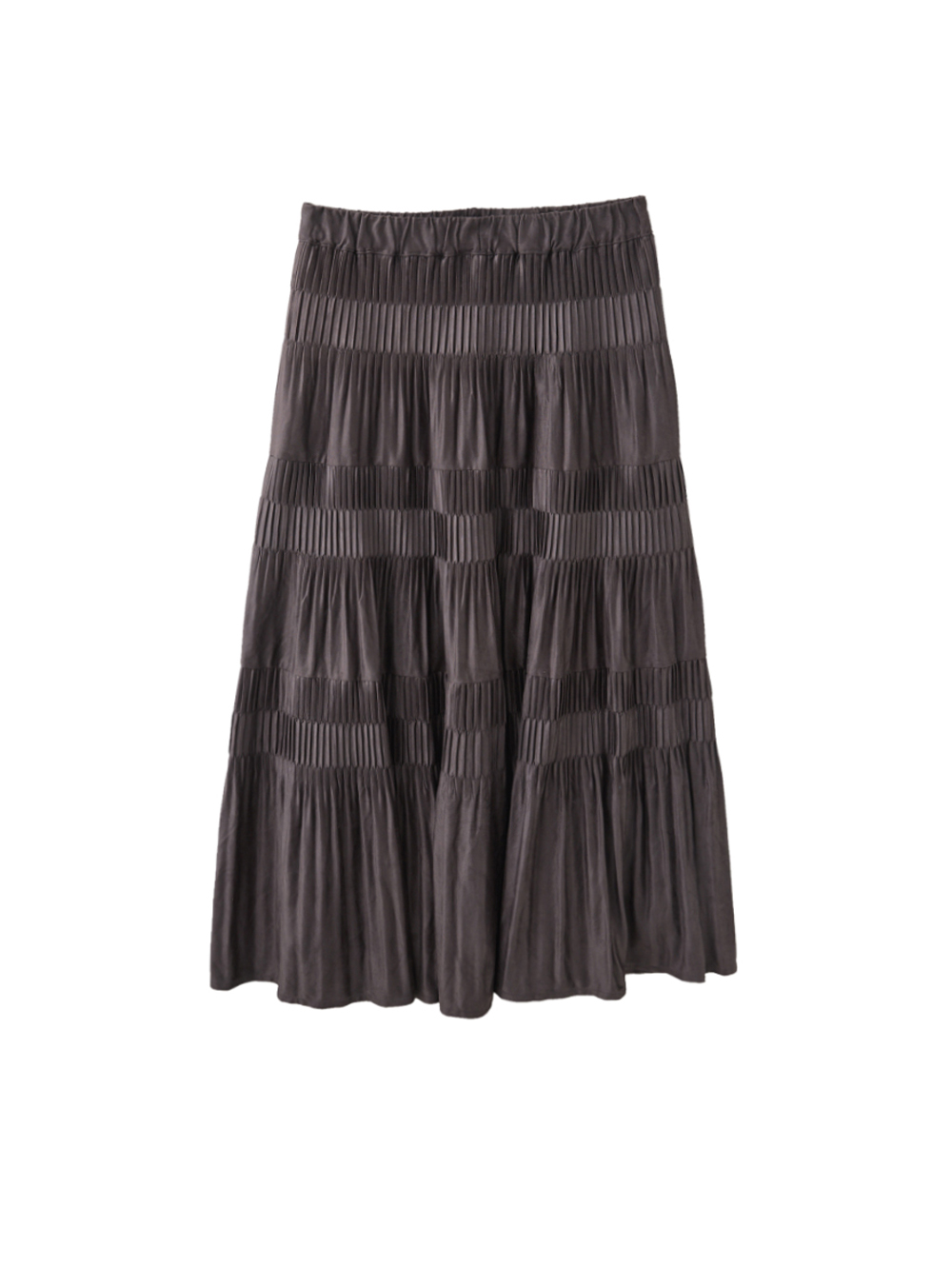 細緻的仿麂皮材質, 呈現出霧面柔光質感, 結合壓褶拼接設計, 層層堆疊出輕盈的律動與立體層次。