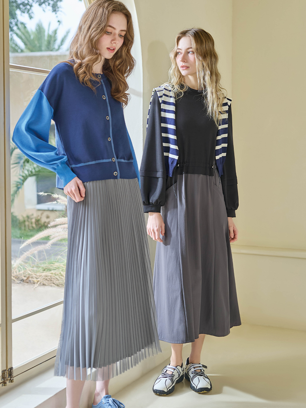 細緻壓褶如同輕霧般層層展開, 行走間自然搖曳, 展現柔和不失存在感的優雅氣質。