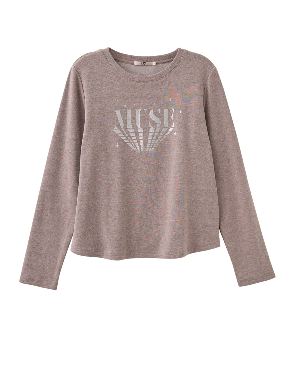 親膚溫暖的內磨毛面料, 一穿上就能感受溫柔包覆感。胸前金屬啞光標語印花, 展現低調時髦的個性態度。