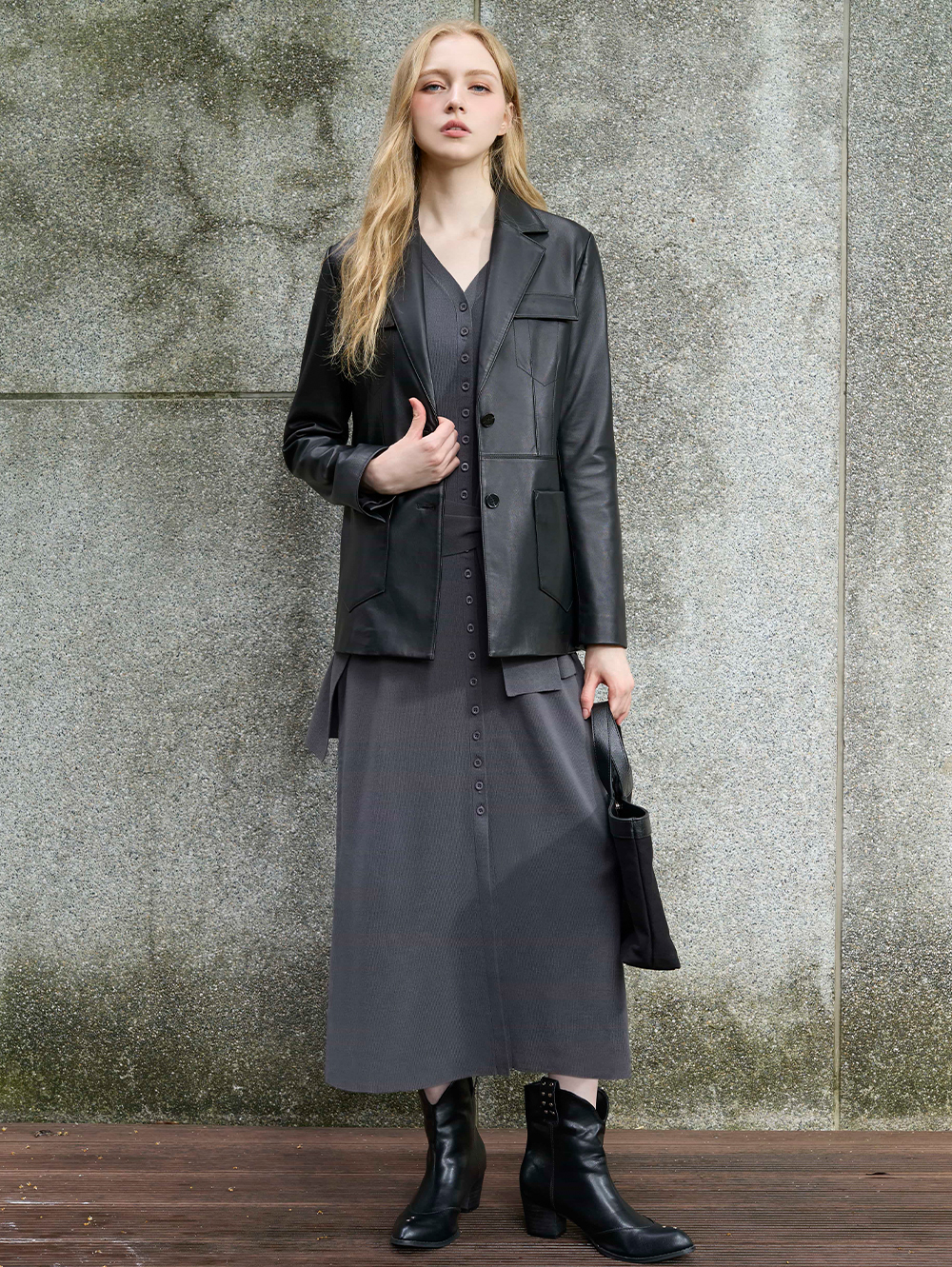 DENOVOV領針織排釦洋裝(附針織披肩)
