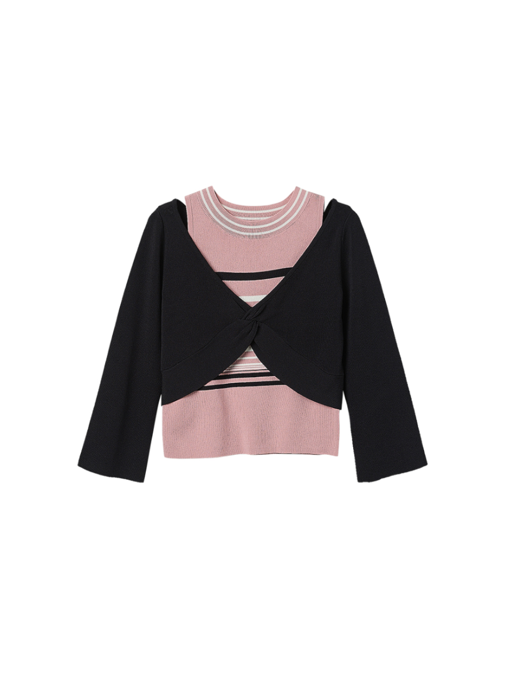 舒適的針織材質,罩衫胸前扭結是造型重點。內搭的背心選用撞色條紋,別緻可愛。