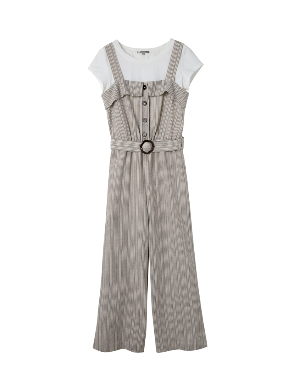 直條紋的布料讓視覺效果更顯腿長。清爽的棉麻材質,做成吊帶褲型,俏皮又有特色。附贈短袖內搭,CP值爆表。