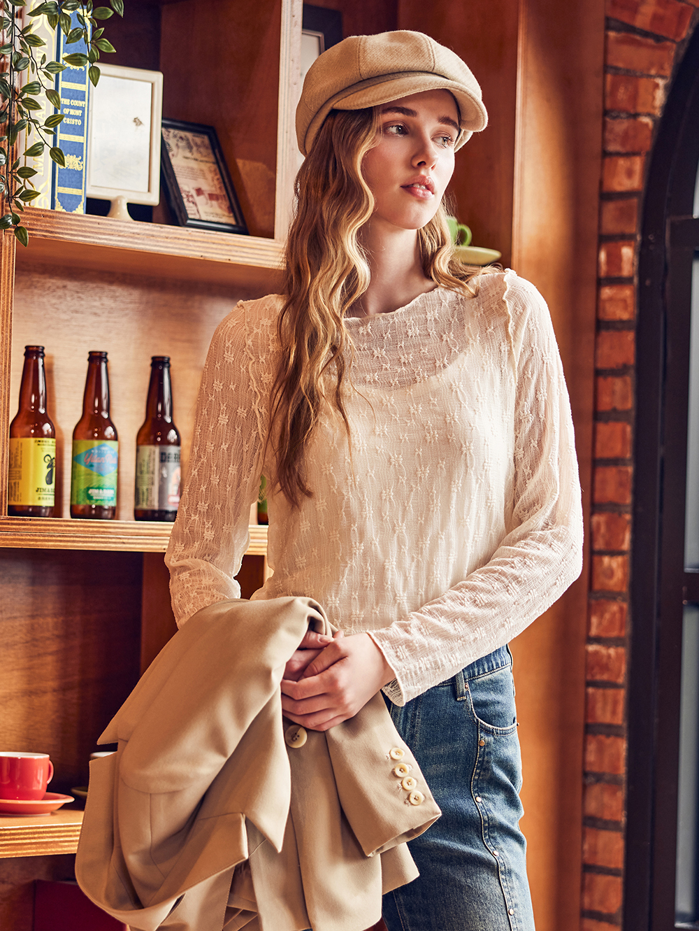 *透膚蕾絲面料 *布料柔軟親膚 *內附肩帶小內搭 *圓領密考呈現波浪造型