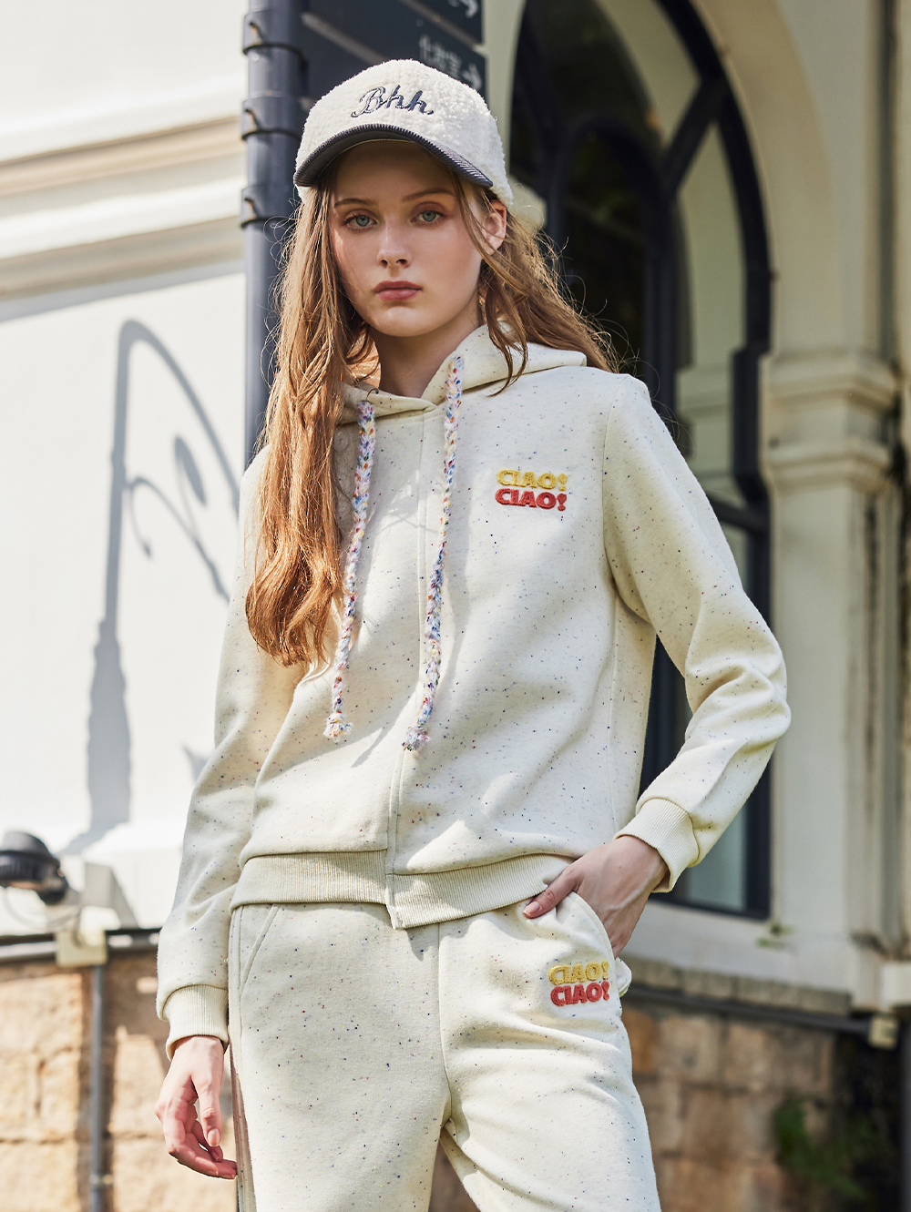 *特殊混色造型面料 *立體繡圖增添細節 *混色抽繩呼應特殊面料 *柔軟面料