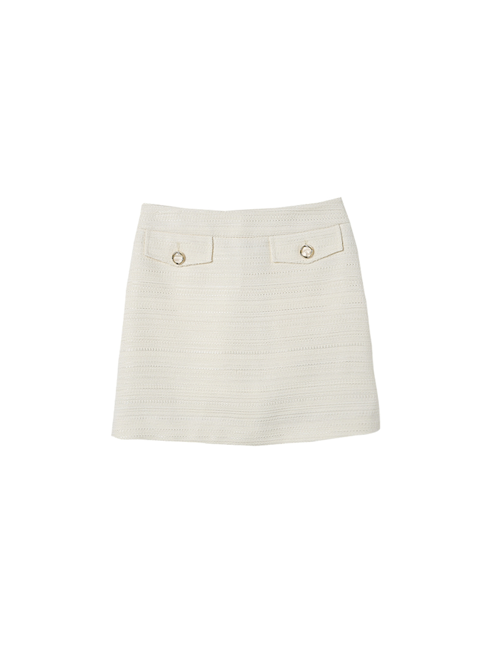 利用修飾的短裙版型,加上特殊釦飾為整體增添視覺亮點,讓套裝短裙不再單調,是摩登風格的穿搭必備單品。