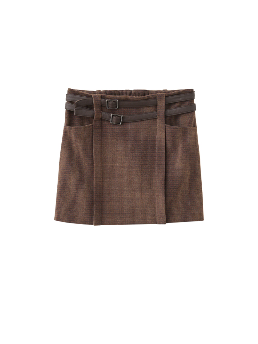 結合溫暖又有挺度的質感細格紋面料, 與雙層水洗皮革腰封細節, 塑造高腰修身比例。