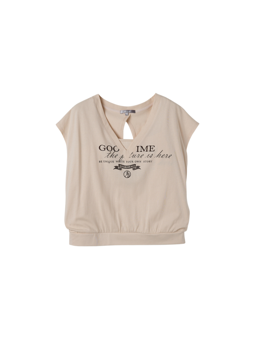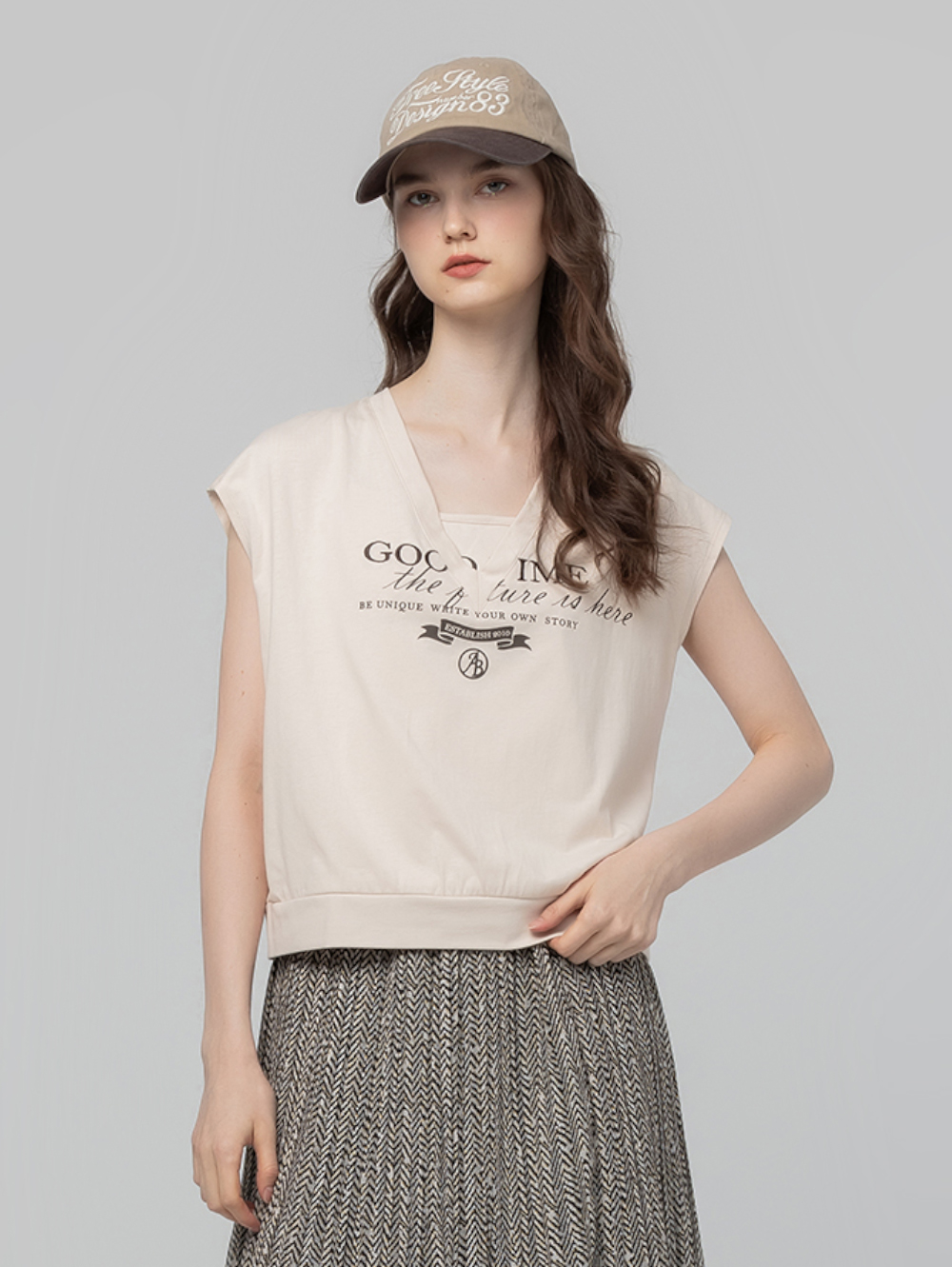 假兩件設計,背心與短袖在內側下擺車固定。正面文字錯位排列、背後小挖空,富有趣味性,穿起來輕鬆感十足。