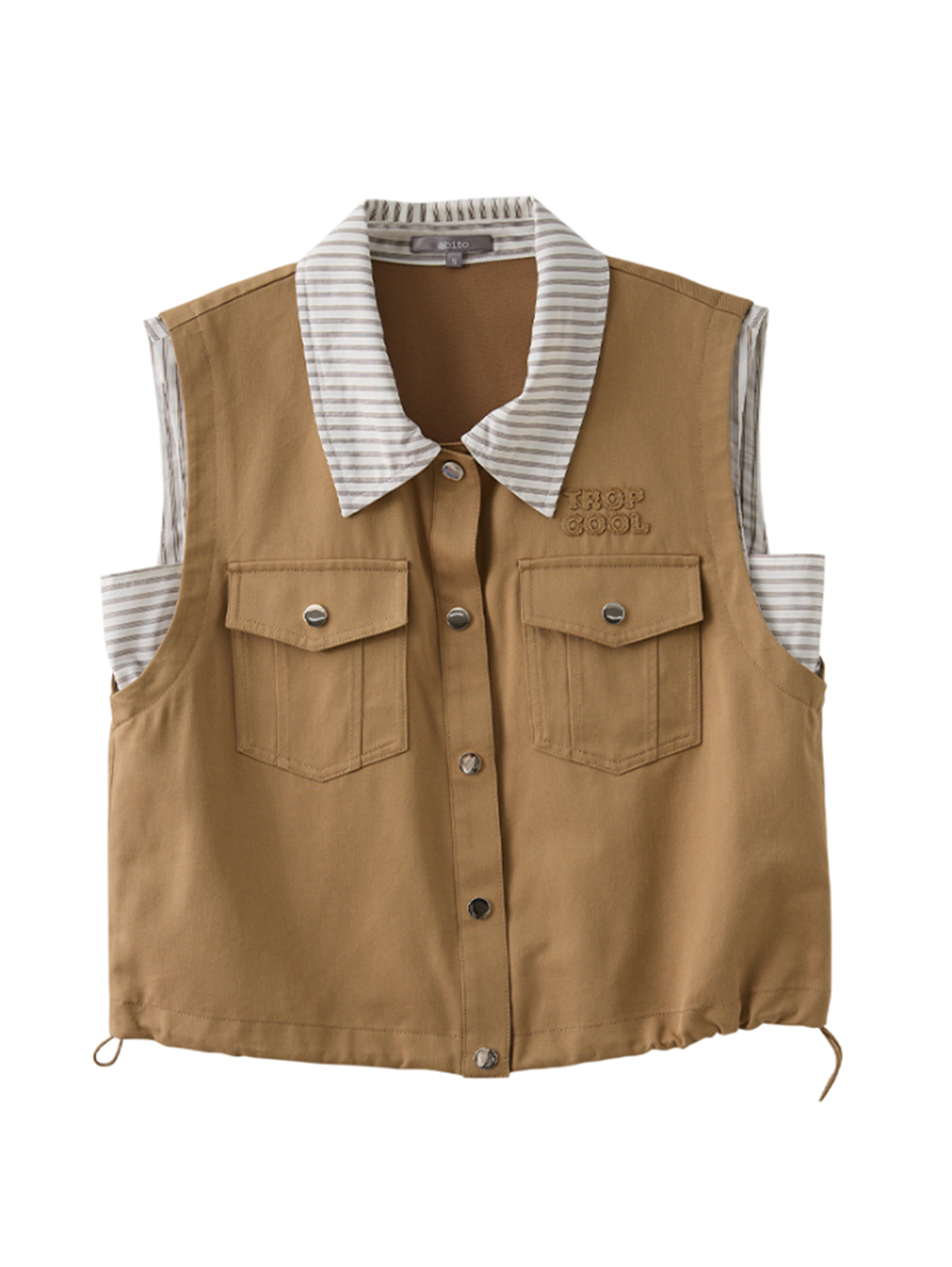 *雙口袋金屬壓釦及精緻刺繡細節 *條紋襯衫面料拼接特色 *下襬抽繩調節環設計 *寬鬆版型設計,適合單穿也可疊穿當外罩搭配
