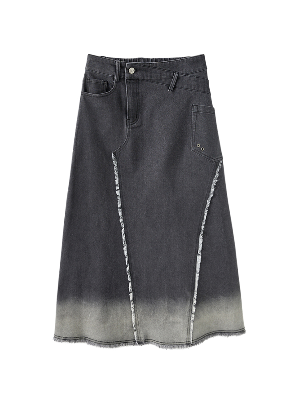*斜邊腰頭造型 *漸層水洗顏色設計 *斜切線條版型剪裁 *抽鬚不收邊細節