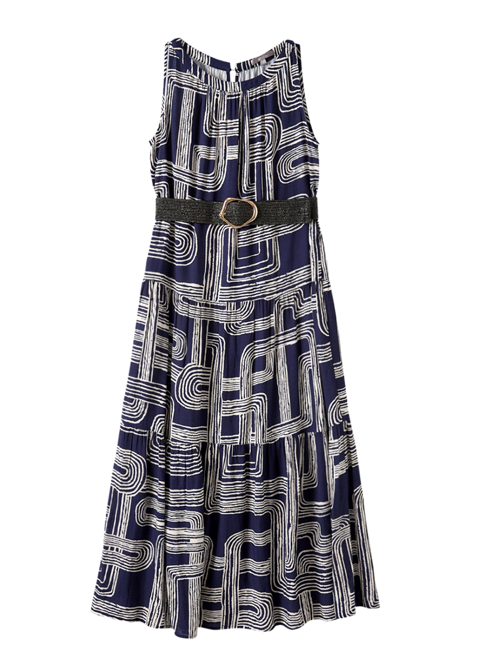 *裙襬三段式層次拼接特色 *獨特線條印花設計 *舒適圓領領口 *寬鬆版型適合各種體型