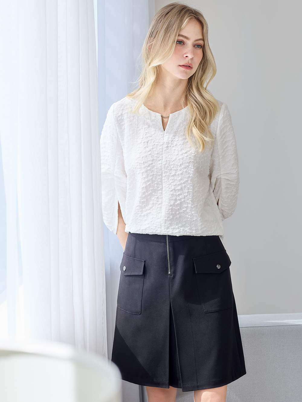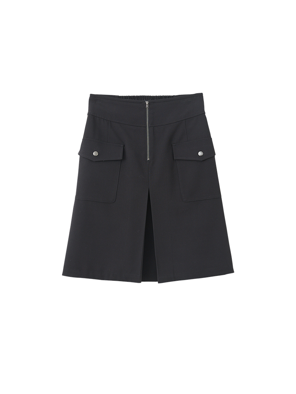 乾淨TR面料帶有職裝氛圍, 大口袋與拉鍊設計增添個性, 擺脫職裝及膝裙的制服感, 讓穿搭更時髦有型。