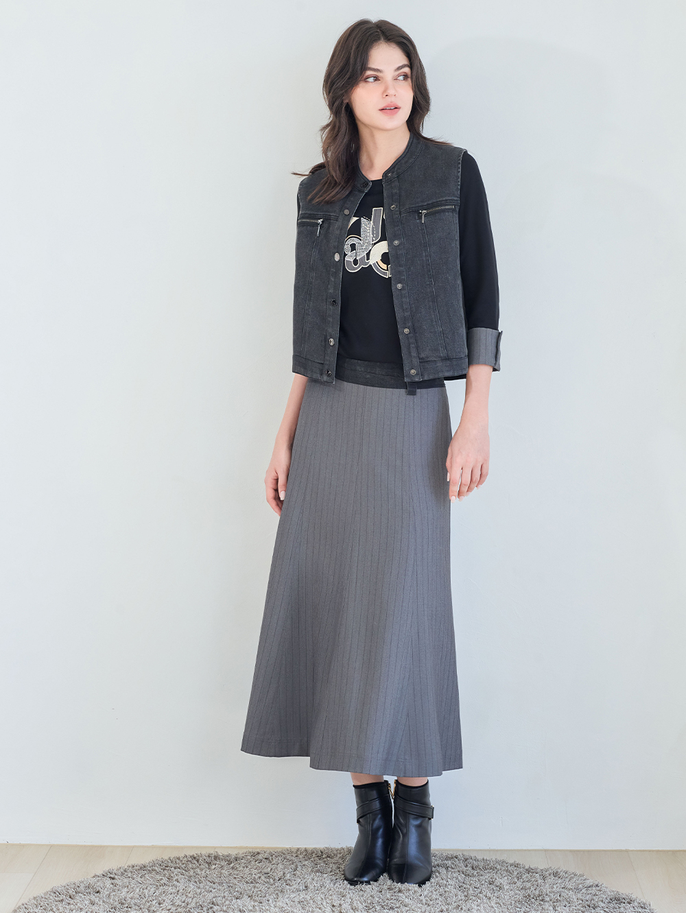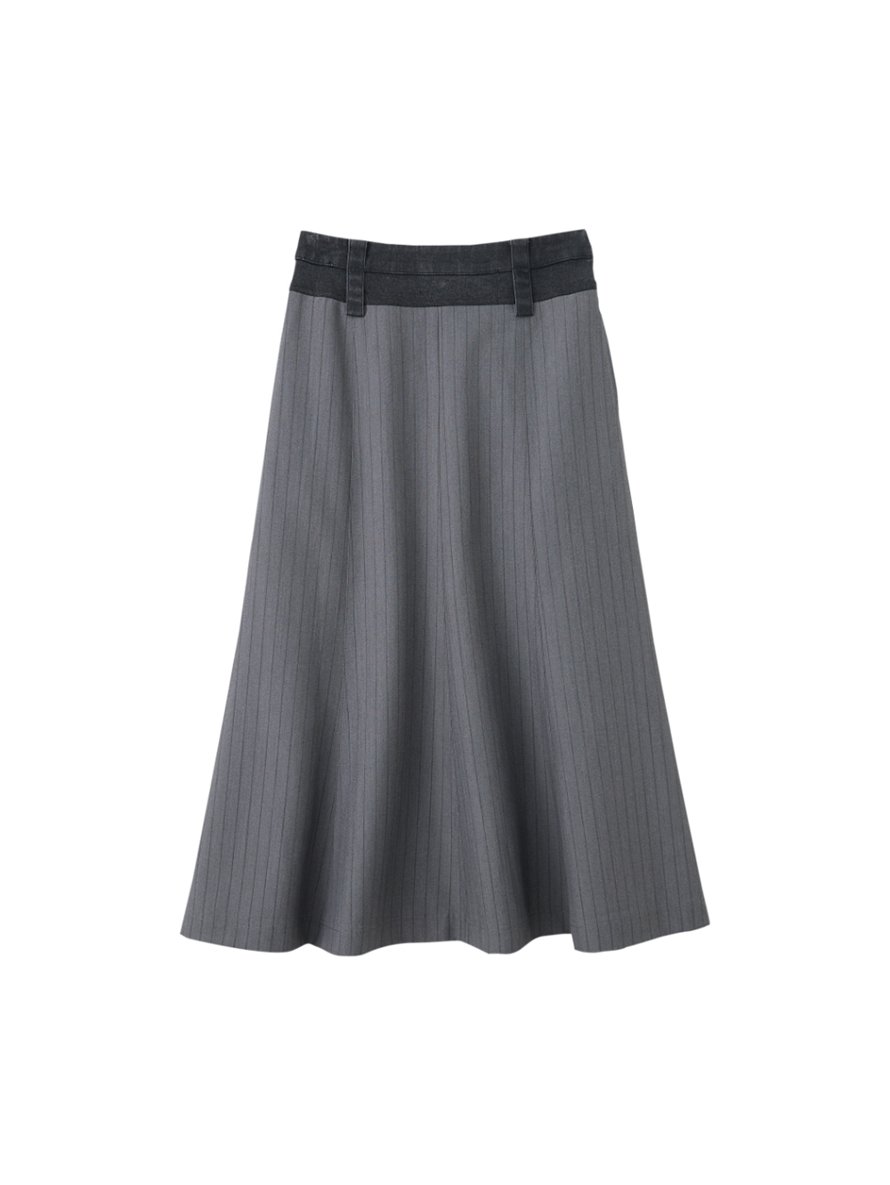 傘擺裙型平衡職裝條紋的中性感, 休閒牛仔與職裝條紋碰撞出更多元的穿衣風格。