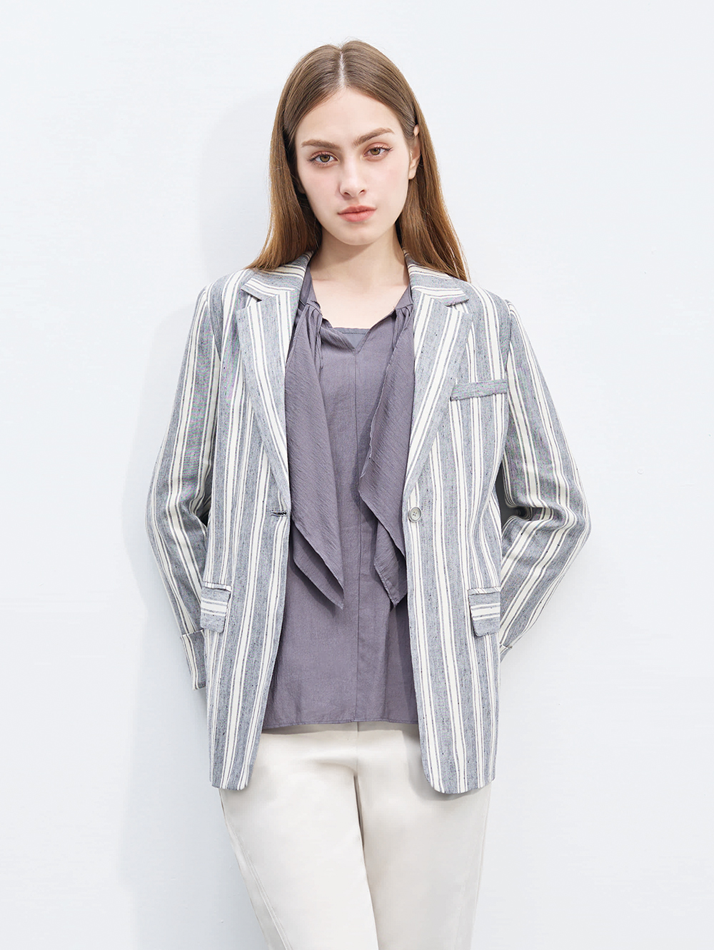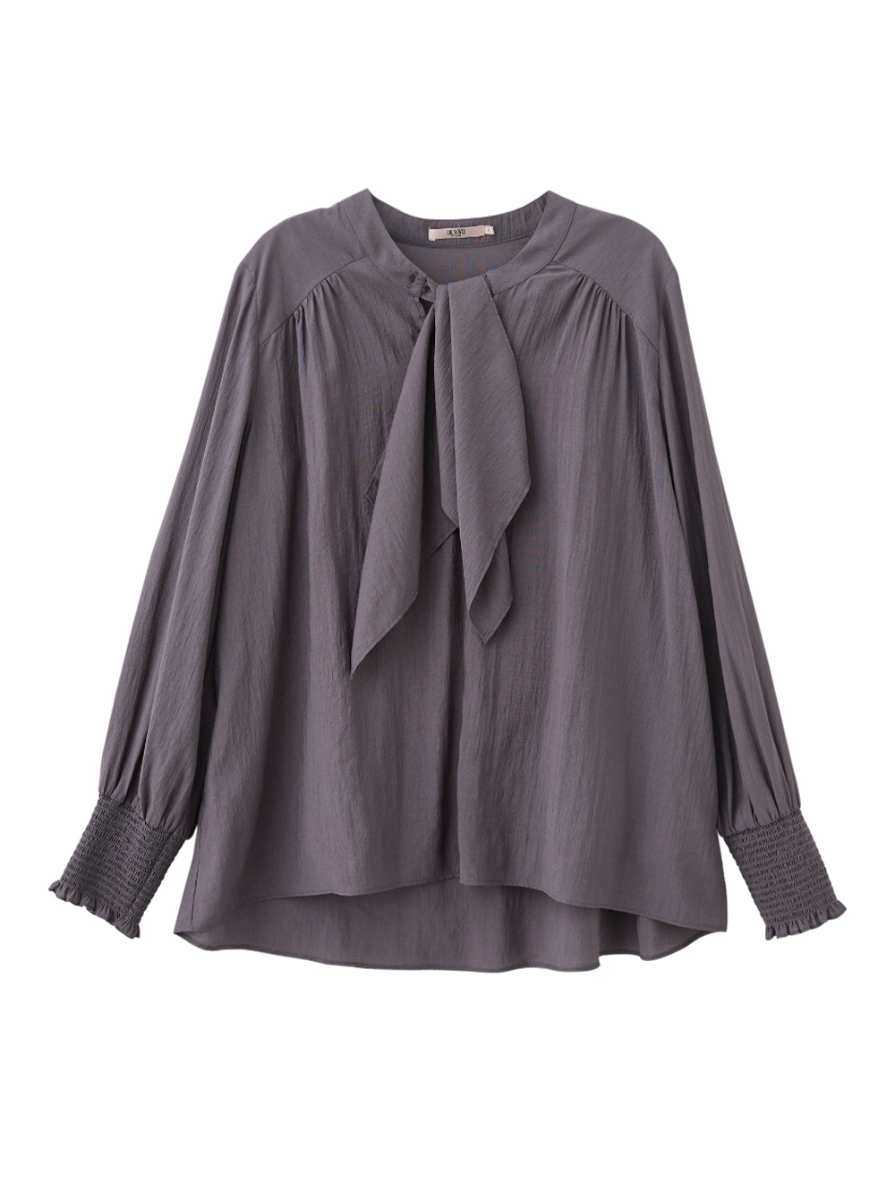 親膚肌理面感, 輕盈不易皺好整理, 領帶設計可自行綁結或穿入孔洞; 袖口鬆緊設計, 營造自然蓬鬆袖型。