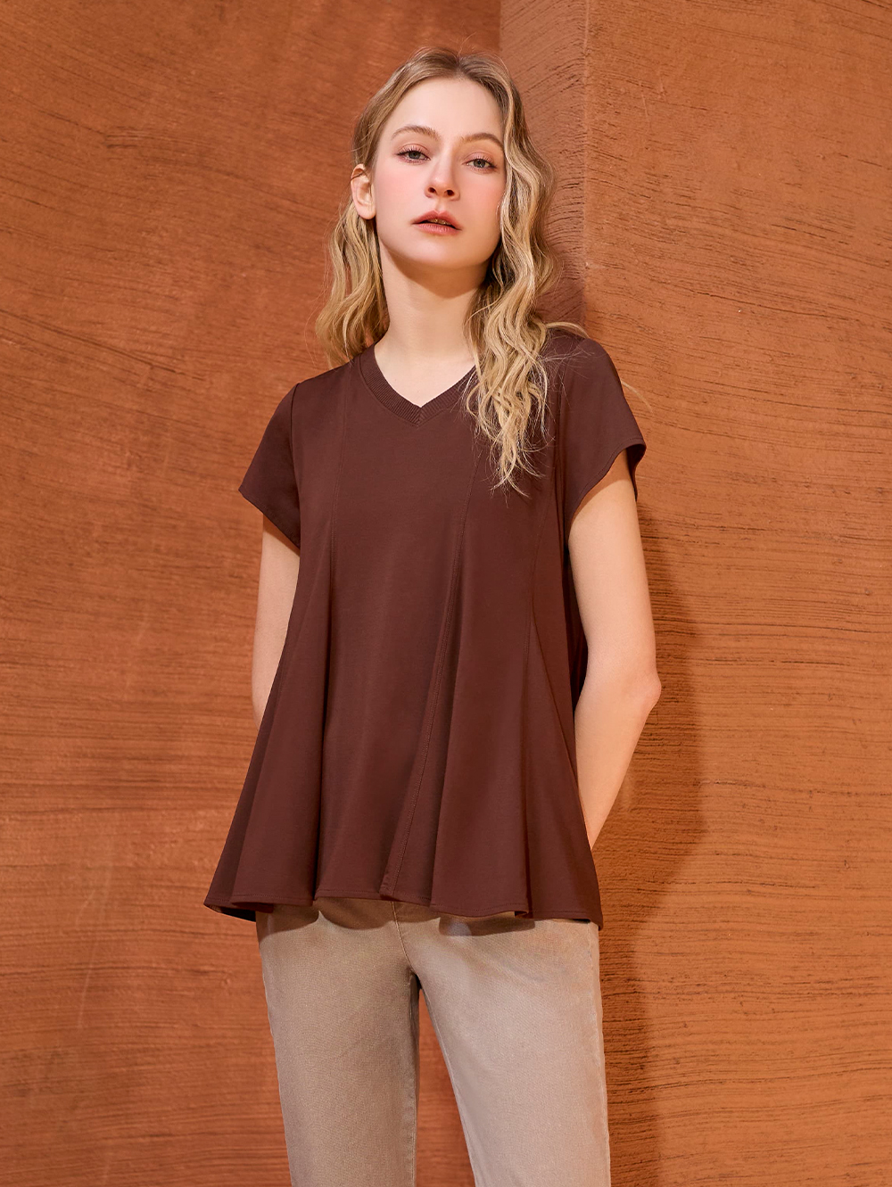 高彈力絲光感面料, 穿著舒適輕盈, 下擺傘狀設計, 利用自然垂墜感修飾腰腹線條, 打造不貼身卻顯瘦的視覺效果。