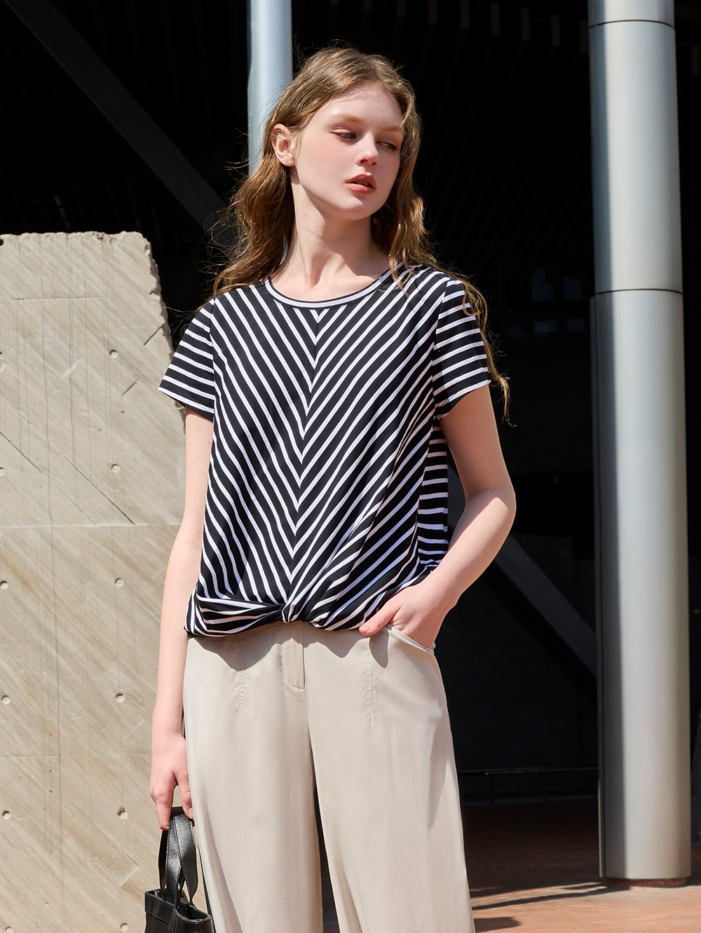 經典條紋結合立體扭結設計, 打造兼具設計感與修身效果的日常上衣。