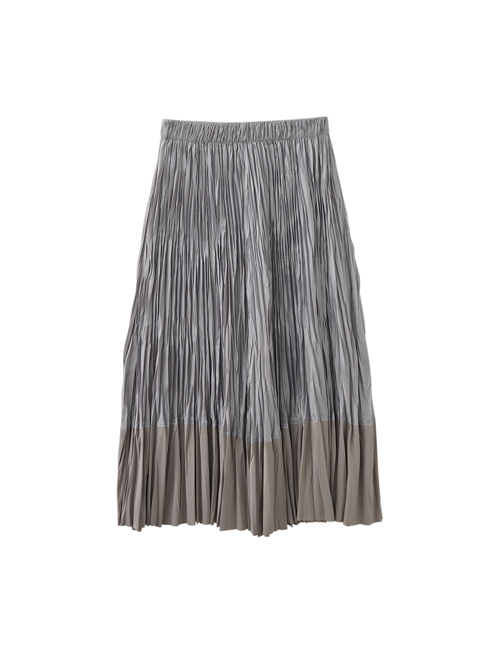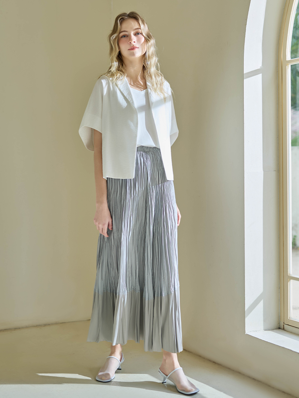 柔和色階拼接, 讓壓摺不只是細節, 而是視覺焦點。輕盈垂墜面料, 經過細致壓摺處理, 行走間自然擺動, 展現低調卻耐看的層次感。