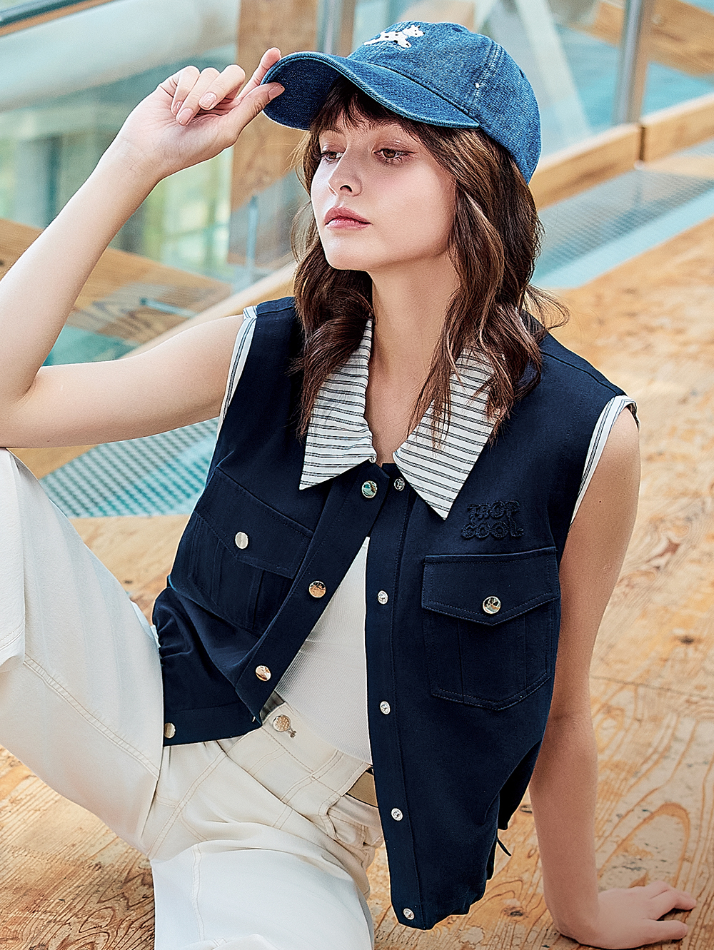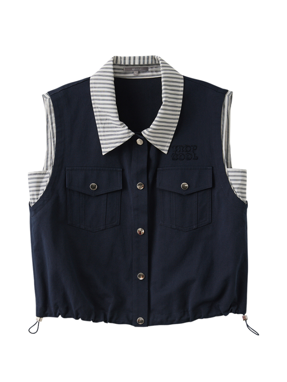 *雙口袋金屬壓釦及精緻刺繡細節 *條紋襯衫面料拼接特色 *下襬抽繩調節環設計 *寬鬆版型設計,適合單穿也可疊穿當外罩搭配