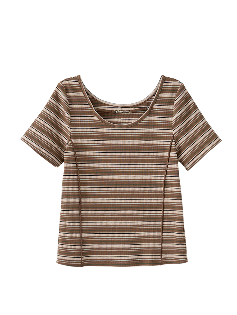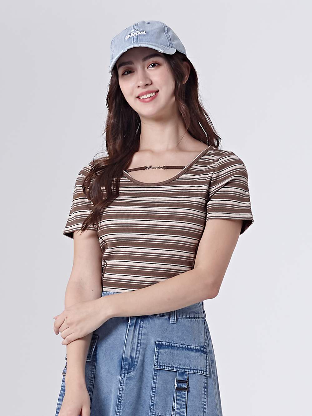 合身版型 鎖骨金屬裝飾增添細節 溫柔色調條紋配色